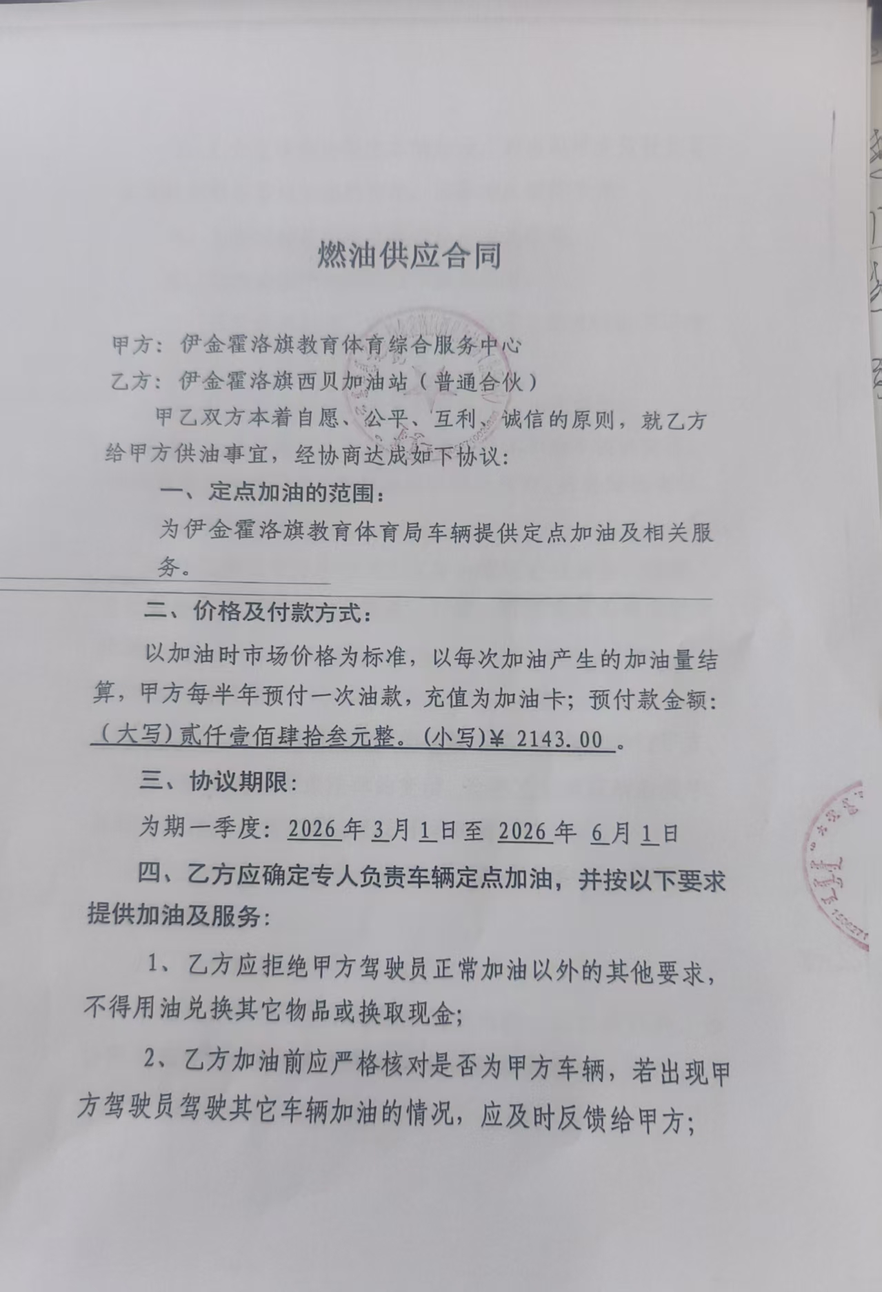 一、合同编号:鄂财购备字(电子)[****]*******号二、合同名称:采购车辆燃料加注服务三、项目编号:鄂财购备字(电子)[****]*******号四、项目名称:采购车辆燃料加注服务五、合同主体采购人(甲方):伊金霍洛旗教育体育综合服务中心 地址:鄂尔多斯市伊金霍洛旗 联系方式:*********** 供应商(乙方):伊金霍洛旗西贝加油站(普通合伙) 地址:内蒙古自治区鄂尔多斯市伊金霍洛旗内蒙古自治区鄂尔多斯市伊金霍洛旗阿镇维一路南、公园街西、公园街辅一路东 联系方式:*********** 六、合同主要信息主要标的: