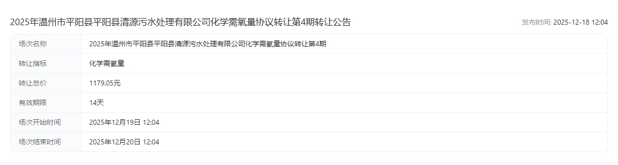 县清源污水处理有限公司化学需氧量协议转让第4期转让公告交易公告