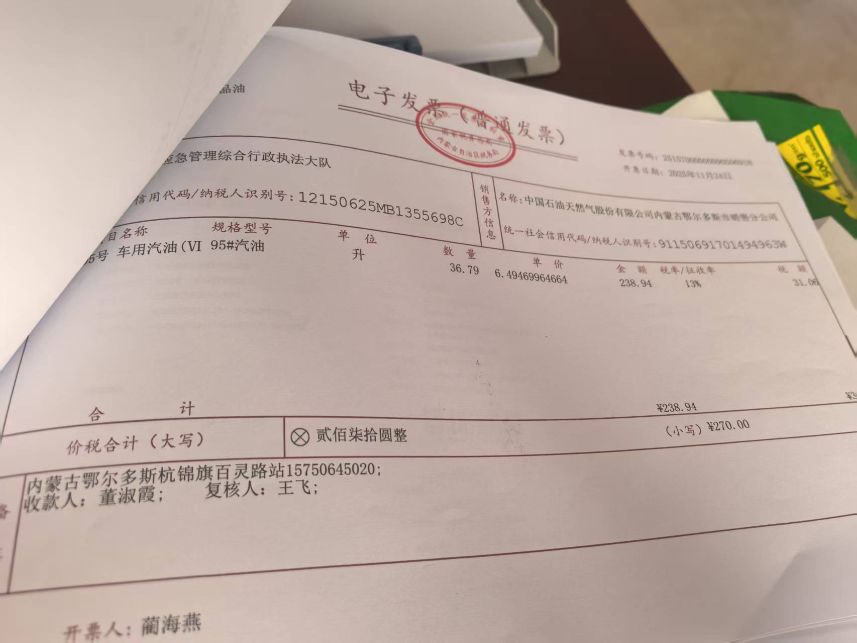 一、合同编号:【****】*******号二、合同名称:车辆加油三、项目编号:鄂财购备字(电子)[****]*******号四、项目名称:车辆加油五、合同主体采购人(甲方):杭锦旗应急管理综合行政执法大队 地址:鄂尔多斯市杭锦旗 联系方式:*********** 供应商(乙方):中国石油天然气股份有限公司内蒙古鄂尔多斯市销售分公司 地址:内蒙古自治区鄂尔多斯市康巴什区正阳街与康盛路交汇处 联系方式:*********** 六、合同主要信息主要标的: