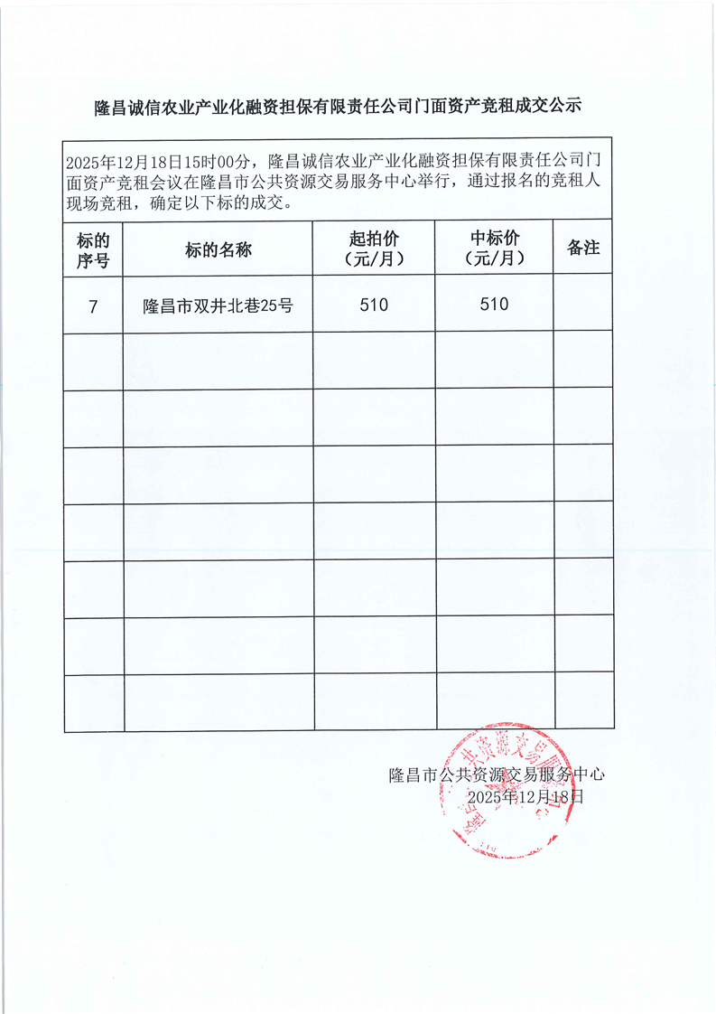 LCJY(2025)C085隆昌诚信农业产业化融资担保有限责任公司门面资产竞租成交公告