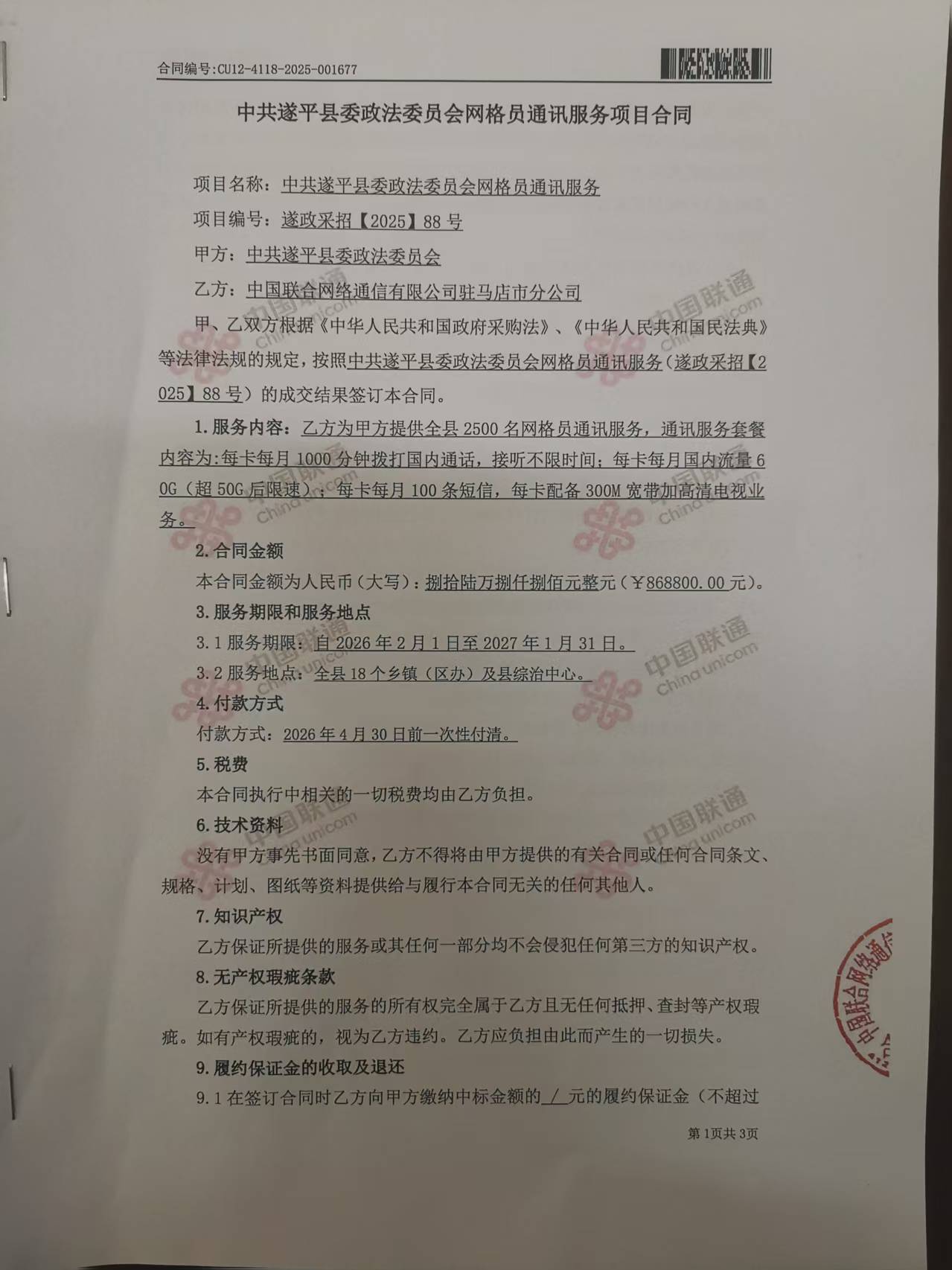 | 二、合同名称:网格员通讯服务 | ||||||||||||