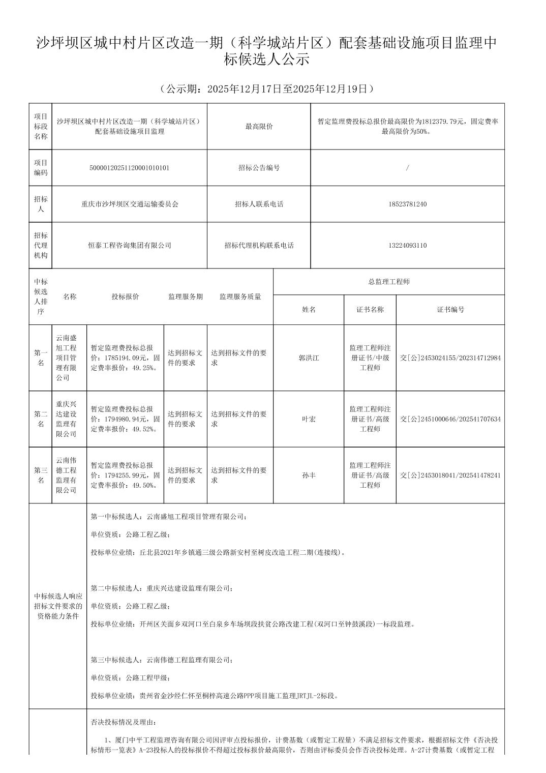 沙坪坝区城中村片区改造一期(科学城站片区)配套基础设施项目监理中标候选人公示