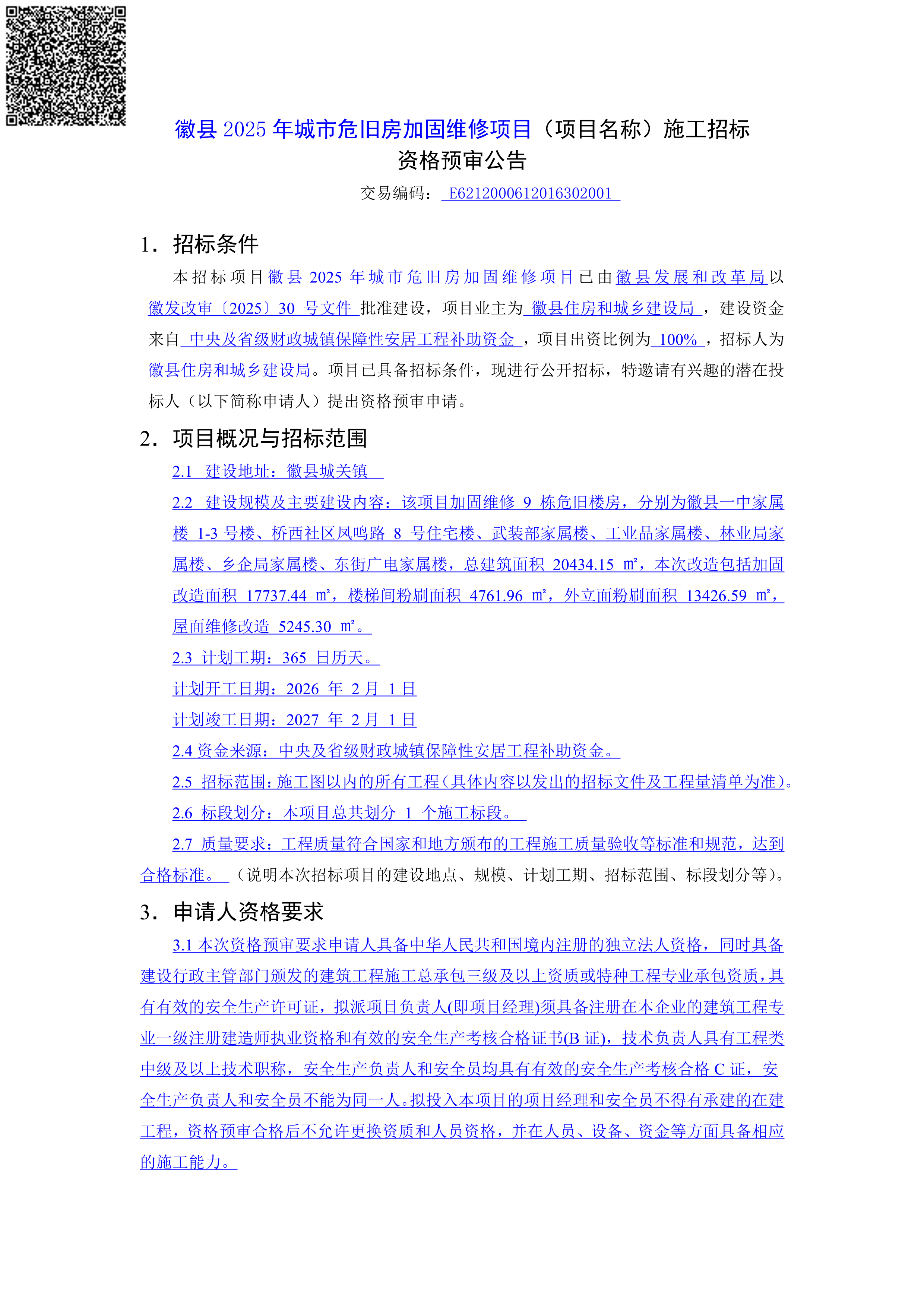 徽县2025年城市危旧房加固维修项目施工招标资格预审公告