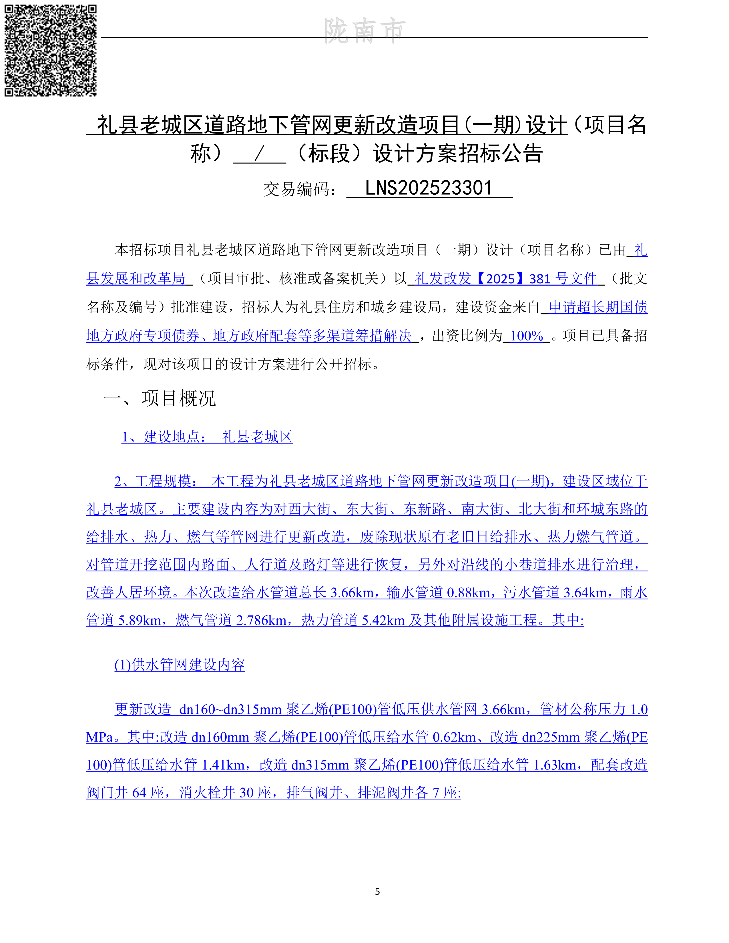礼县老城区道路地下管网更新改造项目(一期)设计方案招标公告