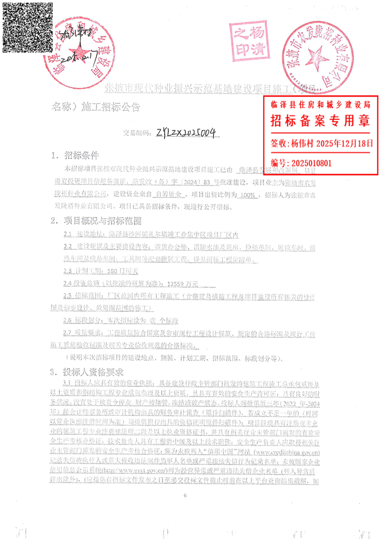 张掖市现代种业振兴示范基地建设项目施工招标公告招标/资审公告