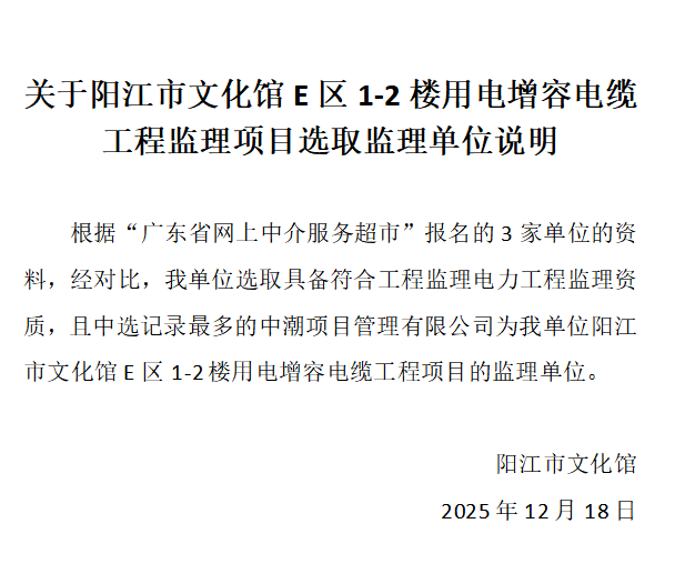 阳江市文化馆E区1-2楼用电增容电缆工程监理服务项目中选公示