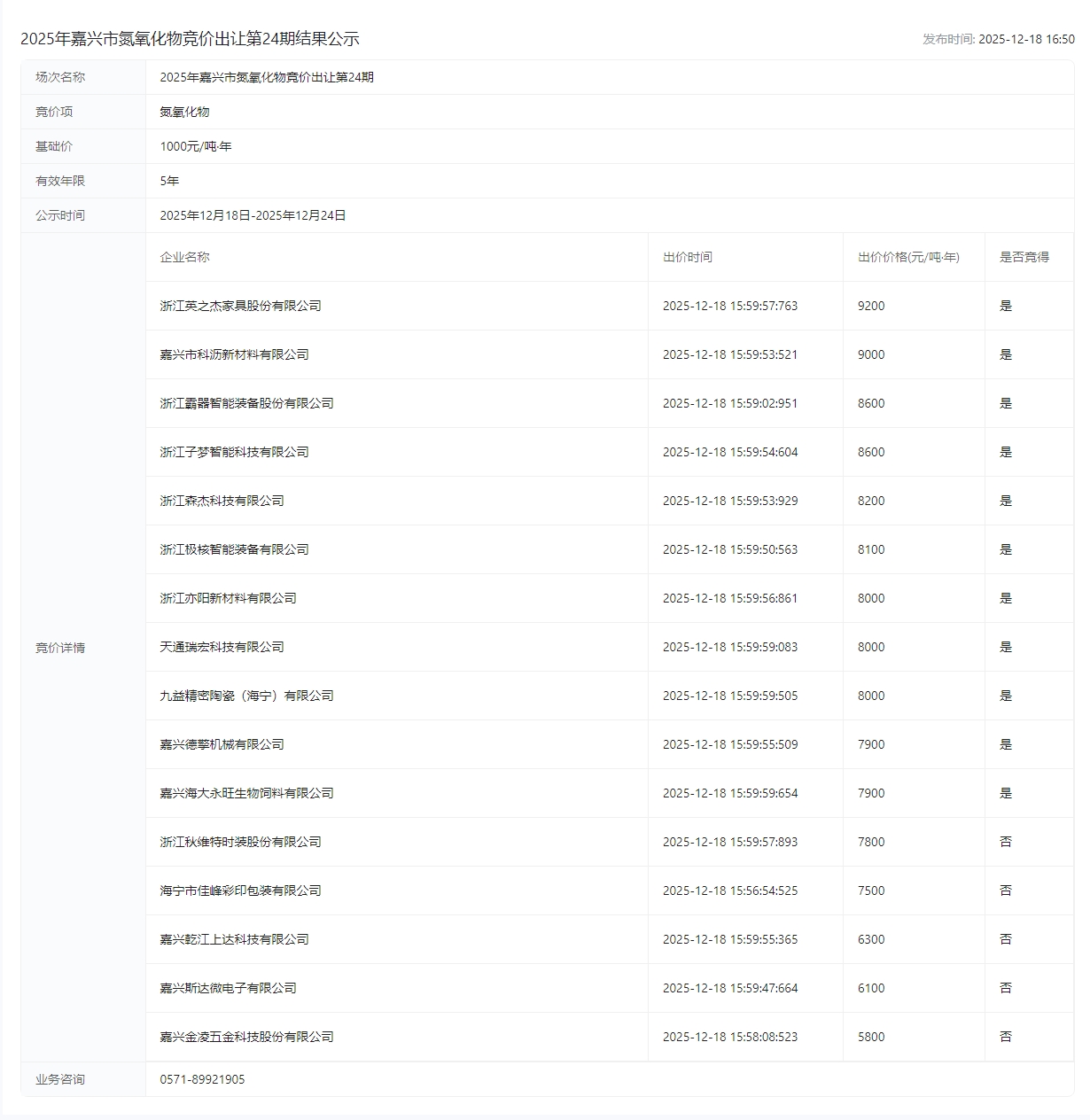 市氮氧化物竞价出让第24期结果公示