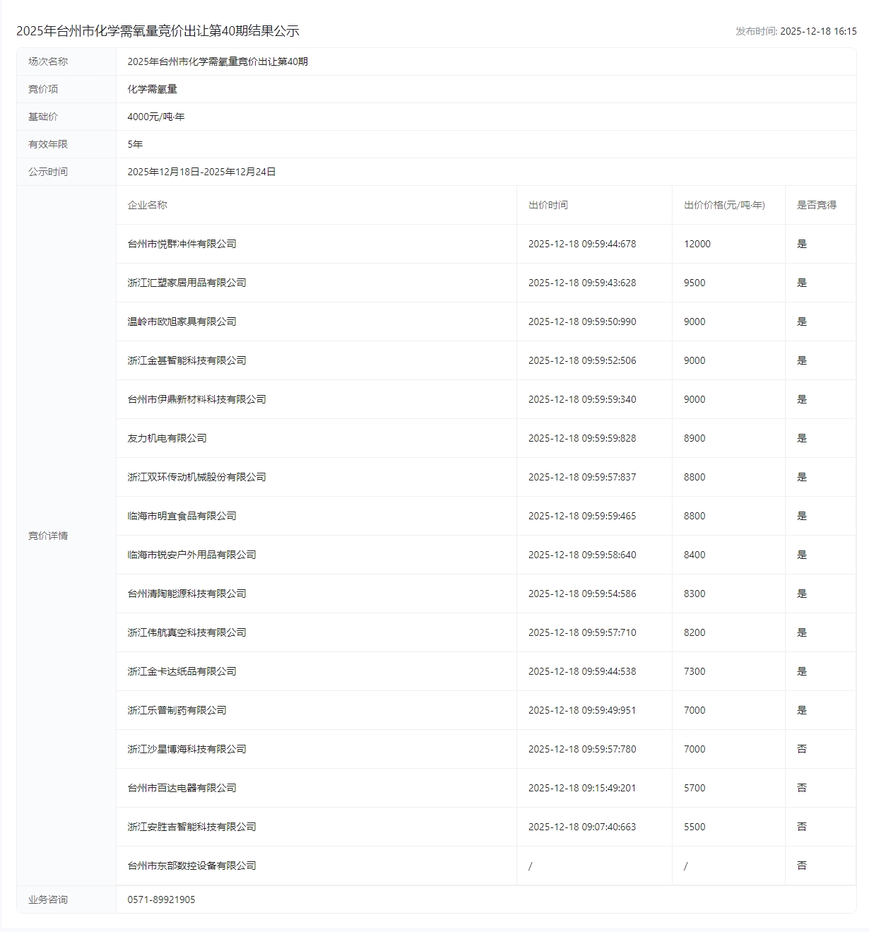 市化学需氧量竞价出让第40期结果公示成交公示