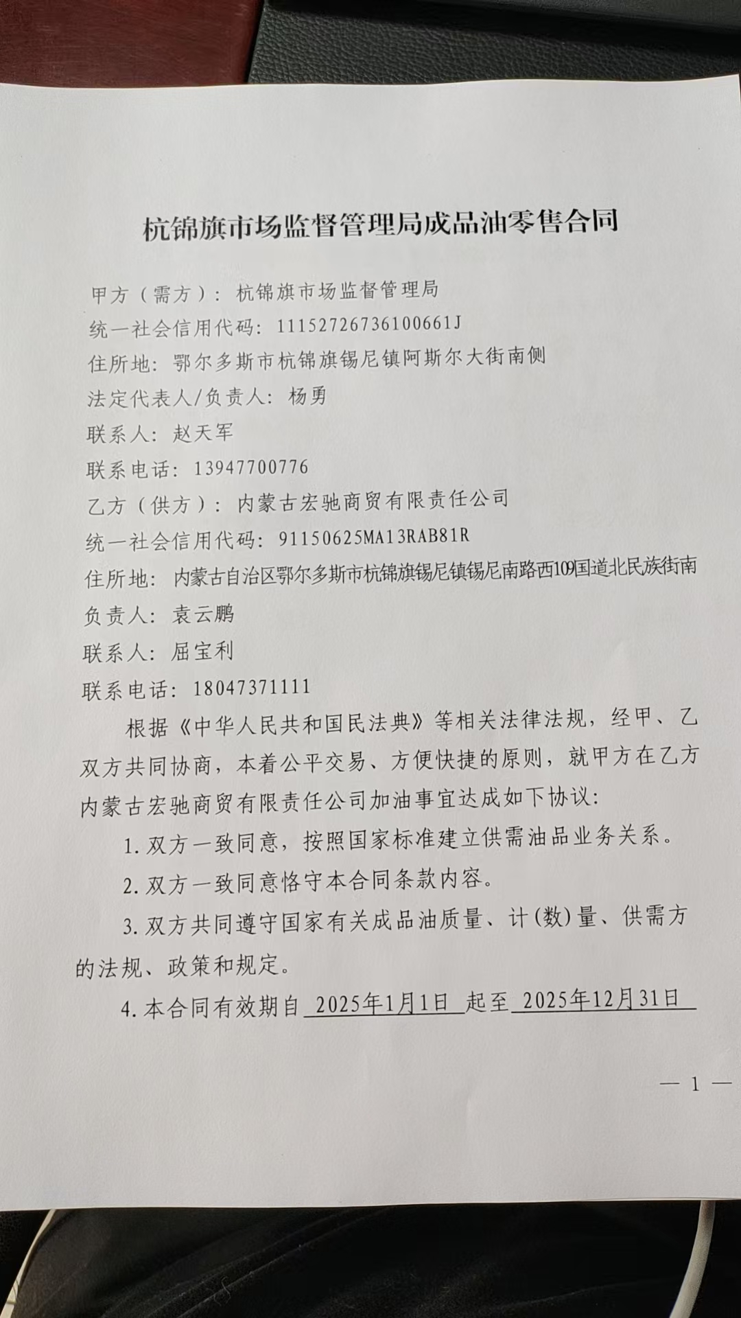 一、合同编号:************二、合同名称:杭锦旗市场监督管理局成品油零售合同三、项目编号:鄂财购备字(电子)[****]*******号四、项目名称:执法车辆加油五、合同主体采购人(甲方):杭锦旗市场监督管理局 地址:鄂尔多斯市杭锦旗锡尼镇阿斯尔大街 联系方式:*********** 供应商(乙方):内蒙古宏驰商贸有限责任公司 地址:内蒙古自治区鄂尔多斯市杭锦旗锡尼镇锡尼南路西***国道北民族街南 联系方式:*********** 六、合同主要信息主要标的: