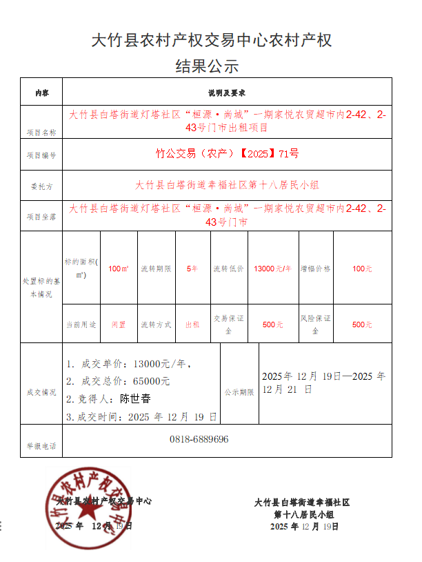 大竹县白塔街道灯塔社区“桓源·尚城”一期家悦农贸超市内****、****号门市出租项目结果公示
