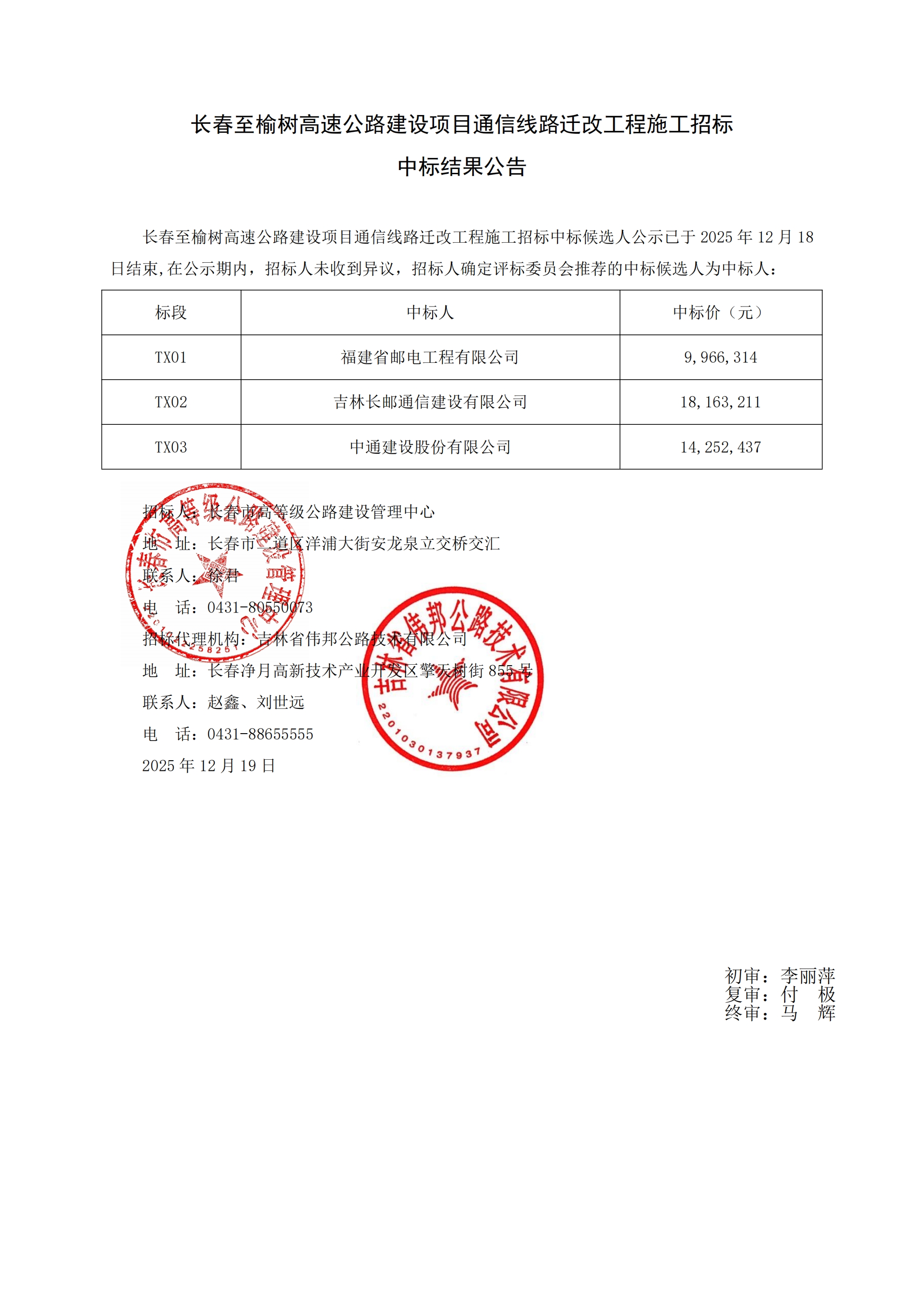 长春至榆树高速公路建设项目通信线路迁改工程施工招标中标结果公告