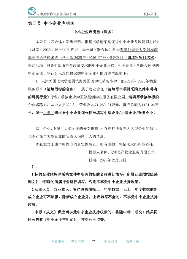 受天津外国语大学附属滨海外国语学校委托,天津市滨海新区政府采购中心以公开招标方式,对天津外国语大学附属滨海外国语学校采购小学一部****年*****年物业服务项目实施采购,现将中标结果公布如下: 一、项目名称和编号 *.项目名称:天津外国语大学附属滨海外国语学校采购小学一部****年*****年物业服务项目 *.项目编号:**************** 二、中标信息 *.中标供应商名称:天津昊润物业服务有限公司 *.中标供应商地址:天津市滨海新区胡家园街道五翠路**号 *.供应商评审报价、评审总得分及排序情况:见附件 *.主要中标标的名称、规格型号、数量、单价、服务要求或者标的基本概况:物业管理服务 三、评标委员会成员名单 何斌、寇葭、张健文、尹玉华、张旭东(采购人代表) 四、项目联系人及联系方式 *.联系人:肖琳 *.联系方式:************ 五、采购人的名称、地址和联系方式 *.采购人名称:天津外国语大学附属滨海外国语学校 *.采购人地址:天津市滨海新区中新天津生态城和韵路****号 *.采购人联系电话:张咪咪,************ 六、采购代理机构的名称、地址和联系方式 *.采购代理机构名称:天津市滨海新区政府采购中心 *.采购代理机构地址:天津市滨海新区营口道***号 *.采购代理机构联系方式:************ 七、质疑方式 参与本项目政府采购活动的供应商认为中标结果使自己的合法权益受到损害的,可以在中标结果公告期限届满之日起*个工作日内,以书面形式向采购人和天津市滨海新区政府采购中心提出质疑,逾期不予受理。 八、本项目不向中标供应商收取服务费。 九、中标结果公告期限 中标结果的公告期限为*个工作日。 十、招标文件公告:见附件
