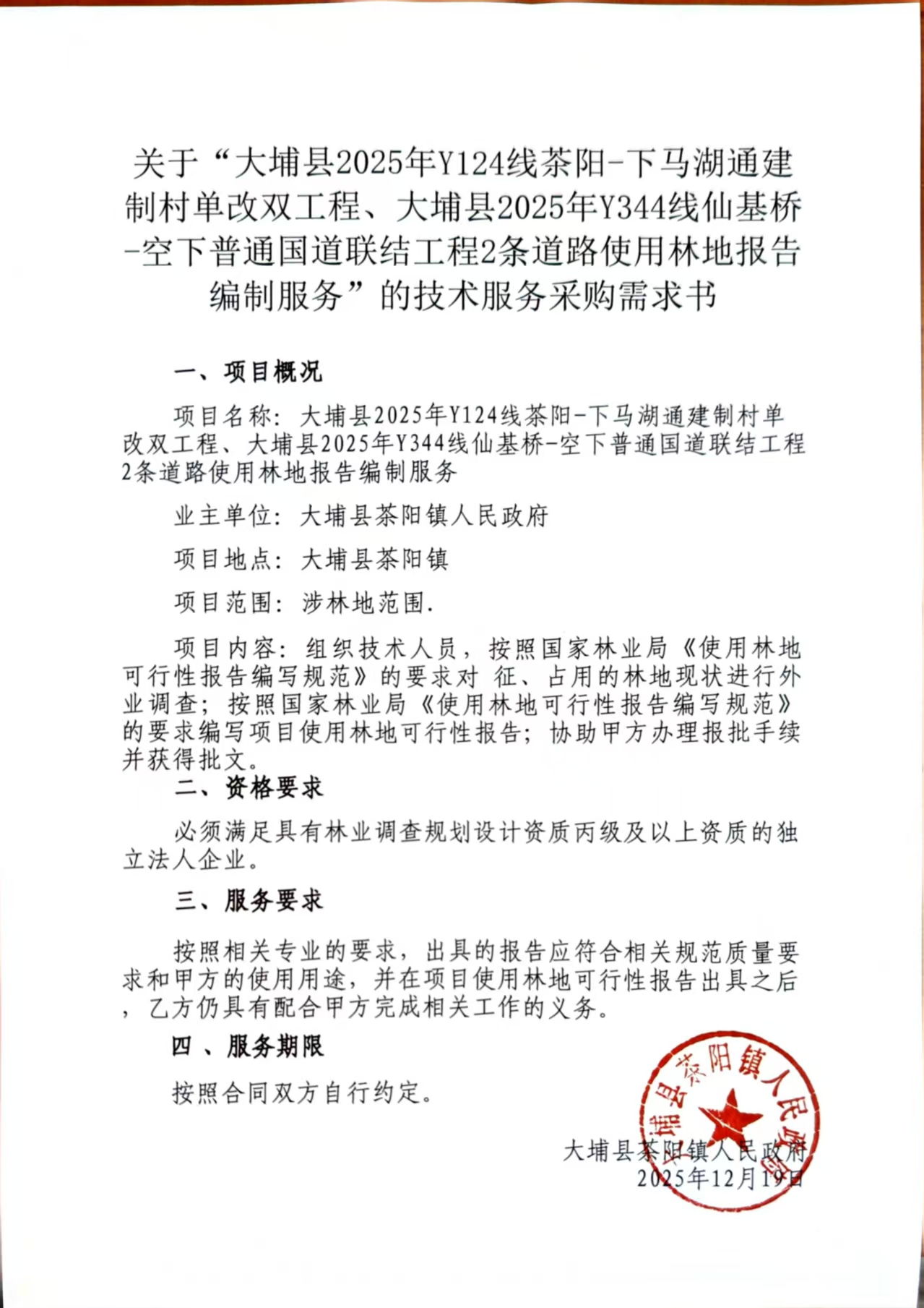 大埔县2025年Y124线茶阳-下马湖通建制村单改双工程、大埔县2025年Y344线仙基桥-空下普通国道联结工程2条道路使用林地报告编制服务采购公告
