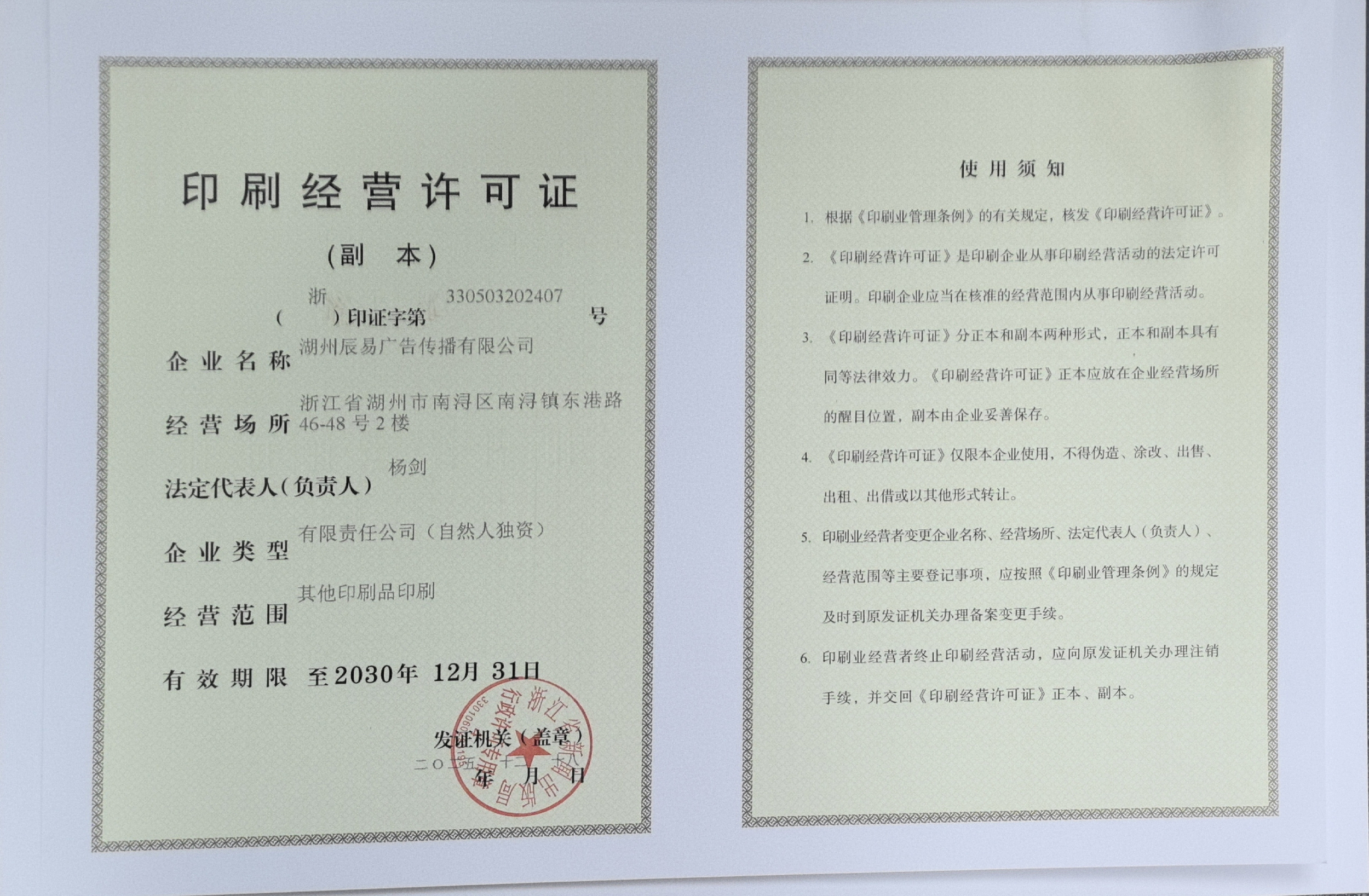 湖州辰易广告传播有限公司印刷服务(《印刷业管理条例》其他印刷品