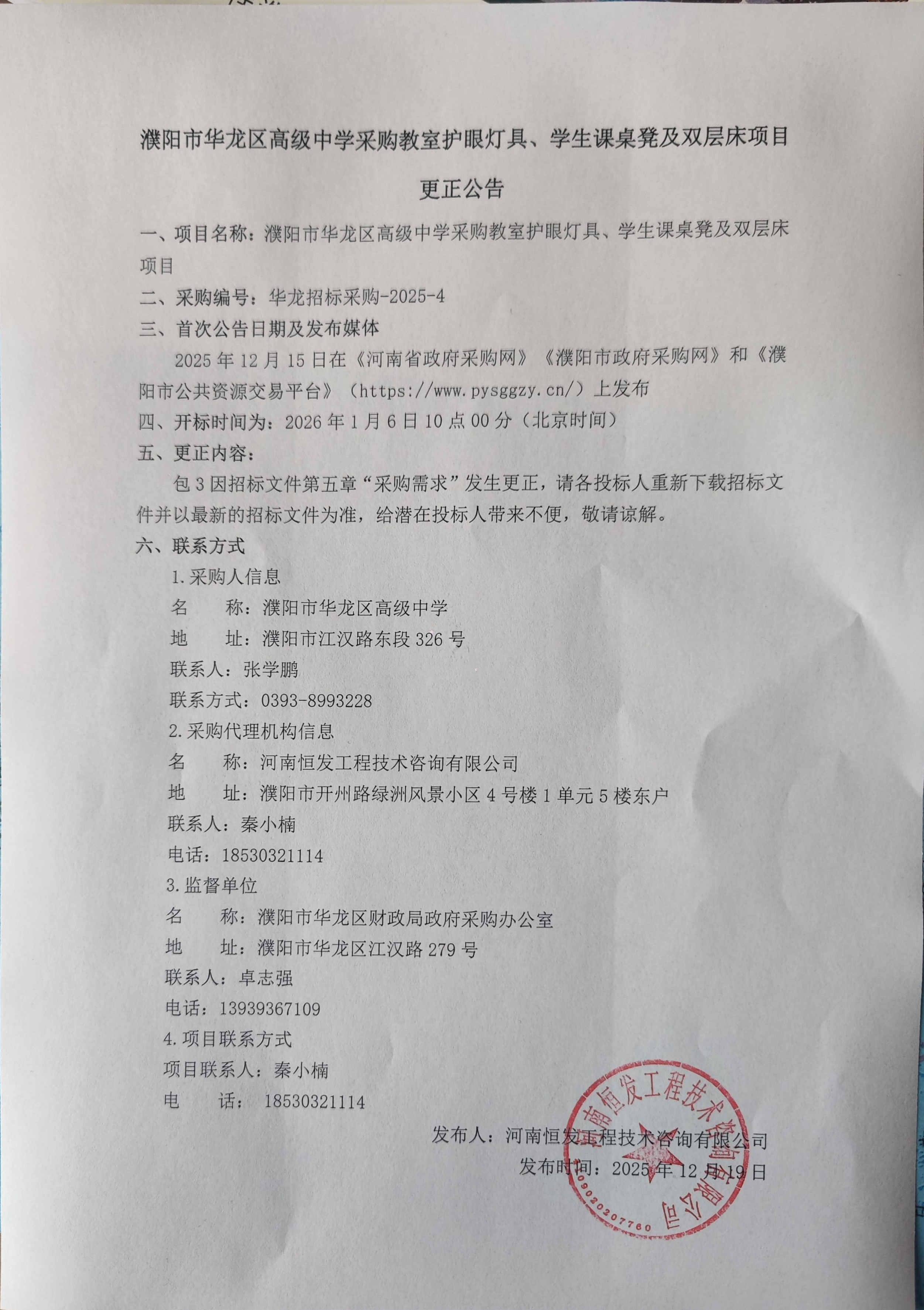濮阳市华龙区高级中学采购教室护眼灯具、学生课桌凳及双层床项目*更正公告