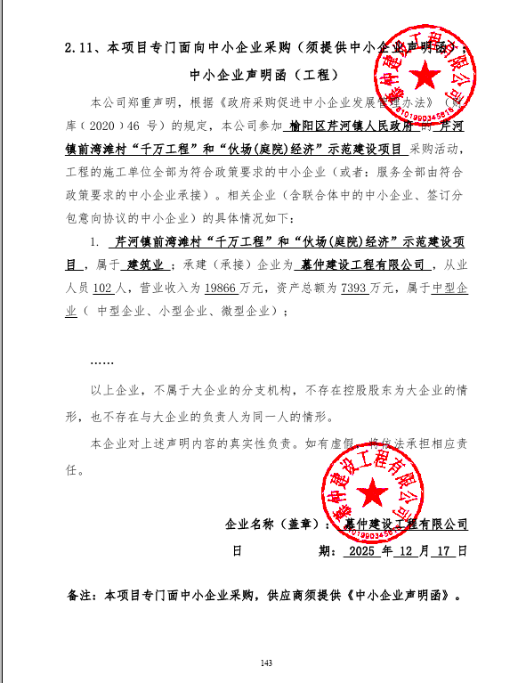 榆阳区芹河镇人民政府芹河镇前湾滩村“千万工程”和“伙场(庭院)经济”示范建设项目中标(成交)结果公告
