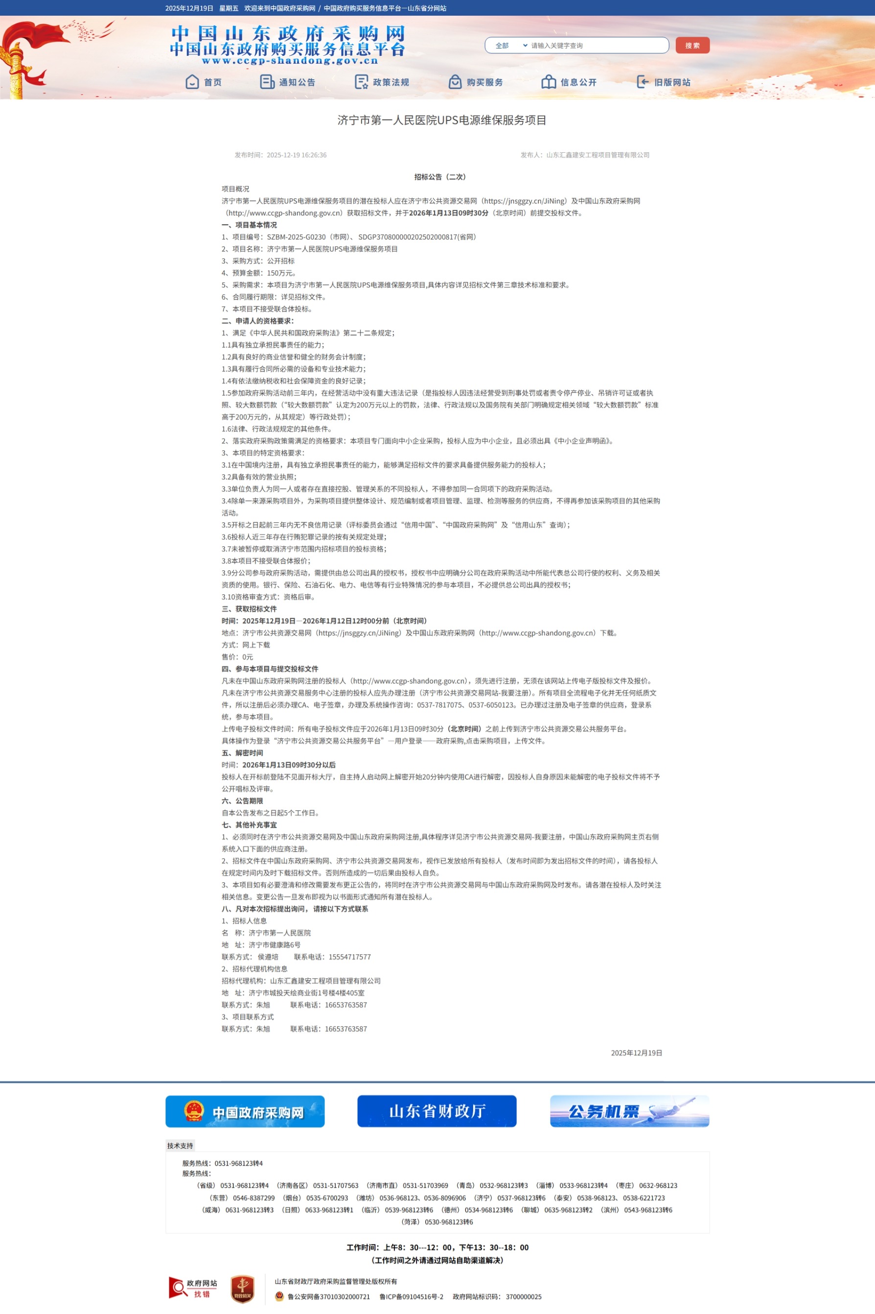 济宁市第一人民医院UPS电源维保服务项目招标公告(二次)