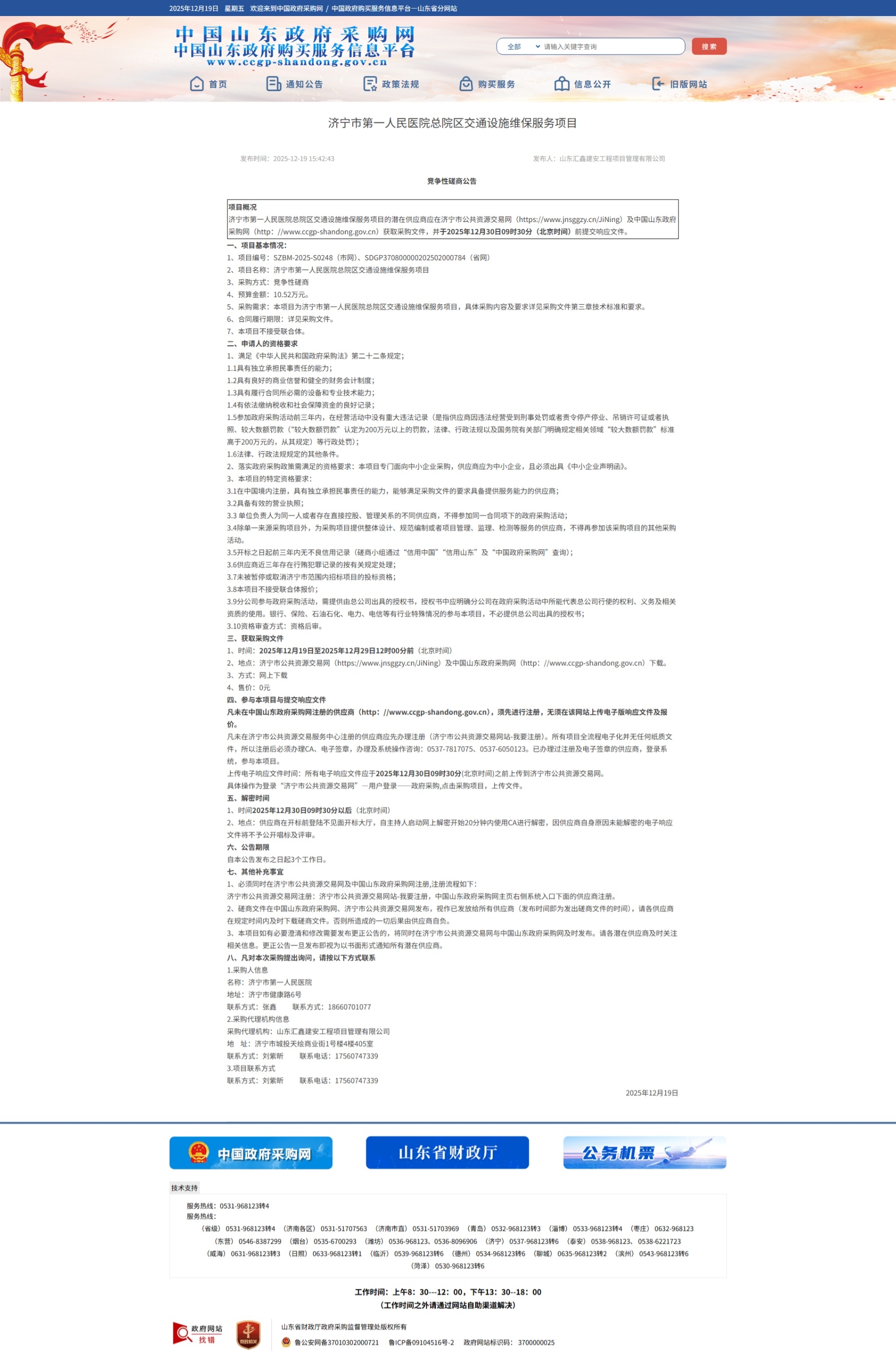 济宁市第一人民医院总院区交通设施维保服务项目竞争性磋商公告