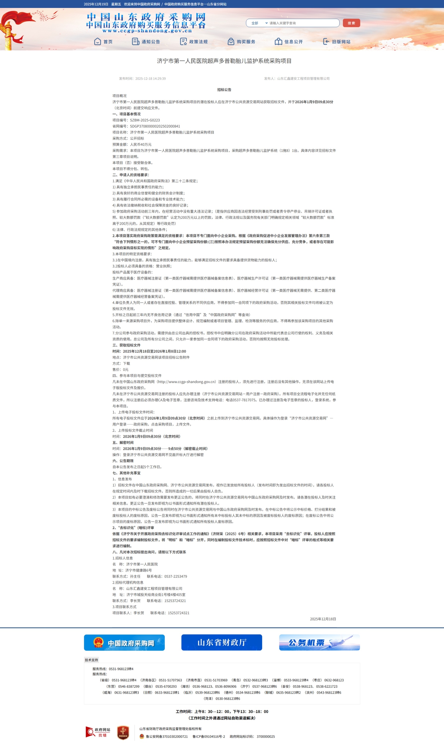 济宁市第一人民医院超声多普勒胎儿监护系统采购项目招标公告