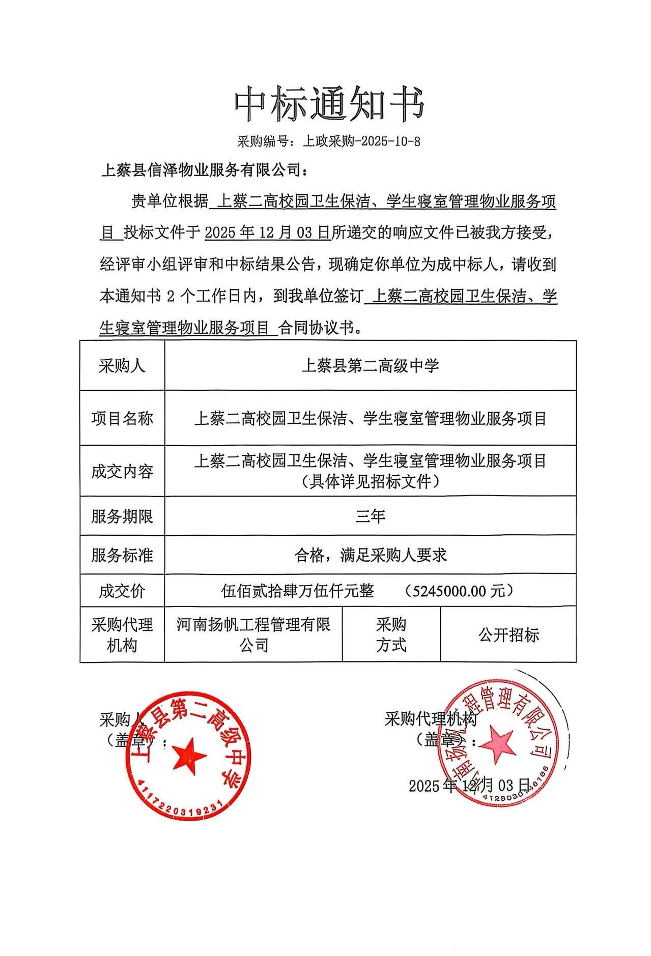 上蔡二高校园卫生保洁、学生寝室管理物业服务项目