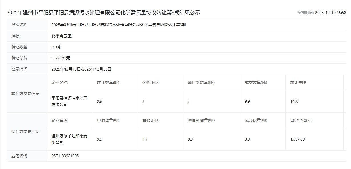 县清源污水处理有限公司化学需氧量协议转让第3期结果公示