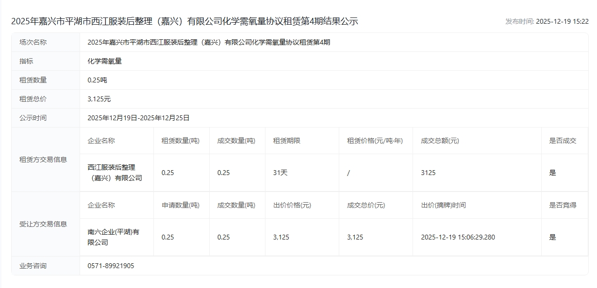 后整理(嘉兴)有限公司化学需氧量协议租赁第4期结果公示