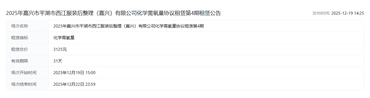 后整理(嘉兴)有限公司化学需氧量协议租赁第4期租赁公告