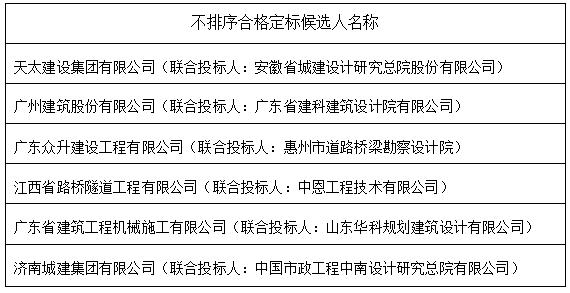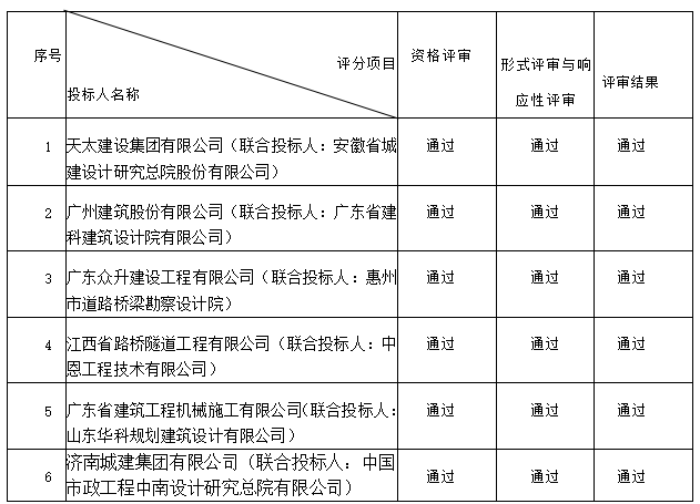天太建设集团有限公司(联合投标人:安徽省城建设计研究总院股份有限公司)、广州建筑股份有限公司(联合投标人:广东省建科建筑设计院有限公司)、广东众升建设工程有限公司(联合投标人:惠州市道路桥梁勘察设计院)、江西省路桥隧道工程有限公司(联合投标人:中恩工程技术有限公司)、广东省建筑工程机械施工有限公司(联合投标人:山东华科规划建筑设计有限公司)、济南城建集团有限公司(联合投标人:中国市政工程中南设计研究总院有限公司)
