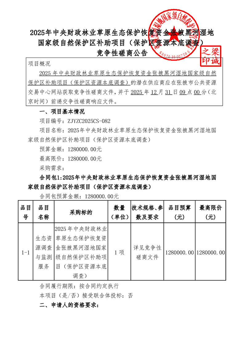 2025年中央财政林业草原生态保护恢复资金张掖黑河湿地国家级自然保护区补助项目(保护区资源本底调查)