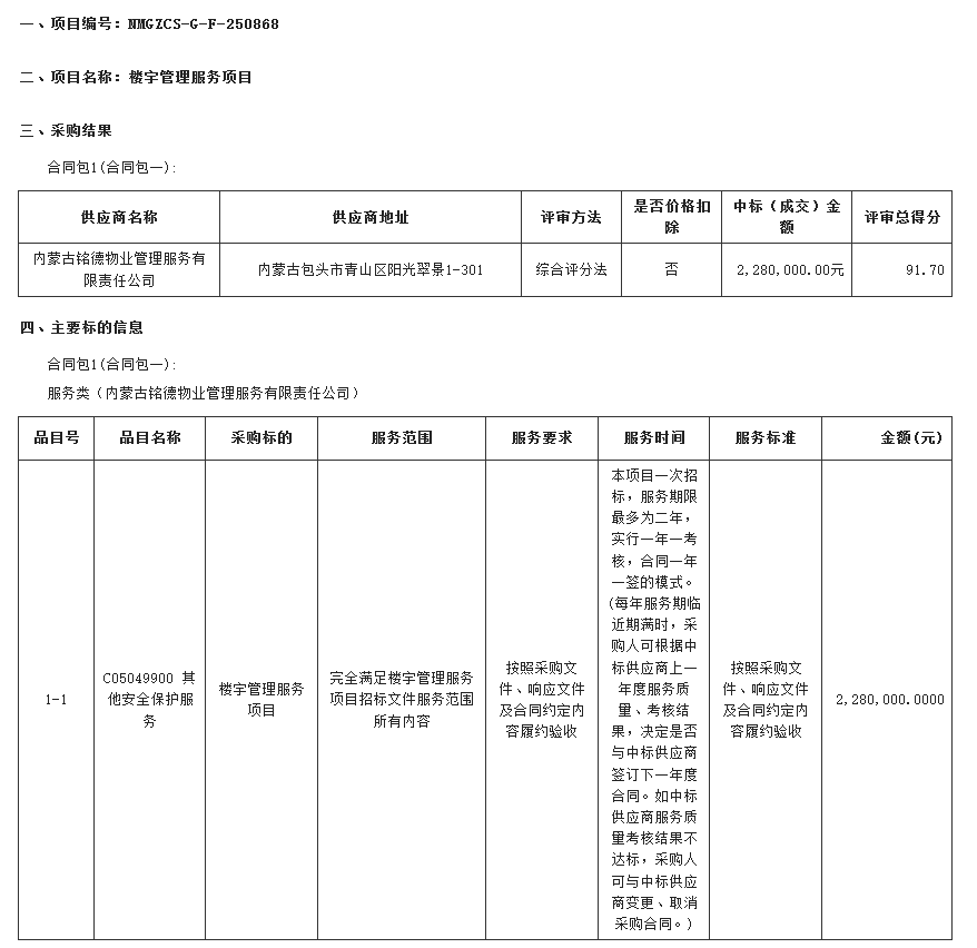 内蒙古科技大学楼宇管理服务项目中标(成交)结果公告