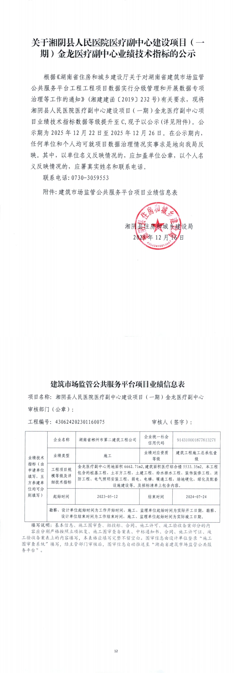 关于湘阴县人民医院医疗副中心建设项目(一期)金龙医疗副中心业绩技术指标的公示