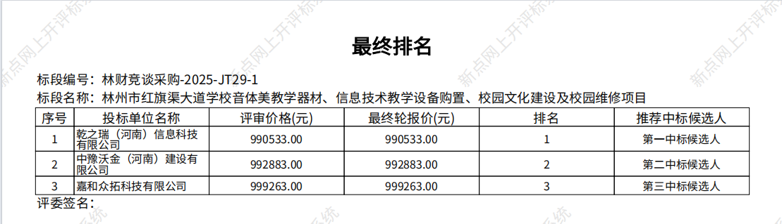 林州市红旗渠大道学校音体美教学器材、信息技术教学设备购置、校园文化建设及校园维修项目四次-成交公告