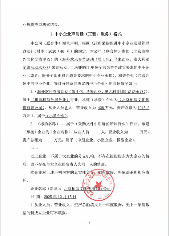 项目用途、简要技术要求根据入境游工作发展需求及****年度重点工作任务,北京市海外文化交流中心拟于****年春节期间组团**人赴澳大利亚悉尼市、马来西亚吉隆坡市举办“欢乐春节”活动,包含*场文艺演出、*场文旅推介会、*场非遗展示、*场“你好,北京”图片展、*场“全球吉庆生肖设计大赛”获奖作品展(以实际需要为准)。活动力求弘扬中国文化、促进文化交流、推动文化产业发展和增进中外民众的互相了解和亲近感。