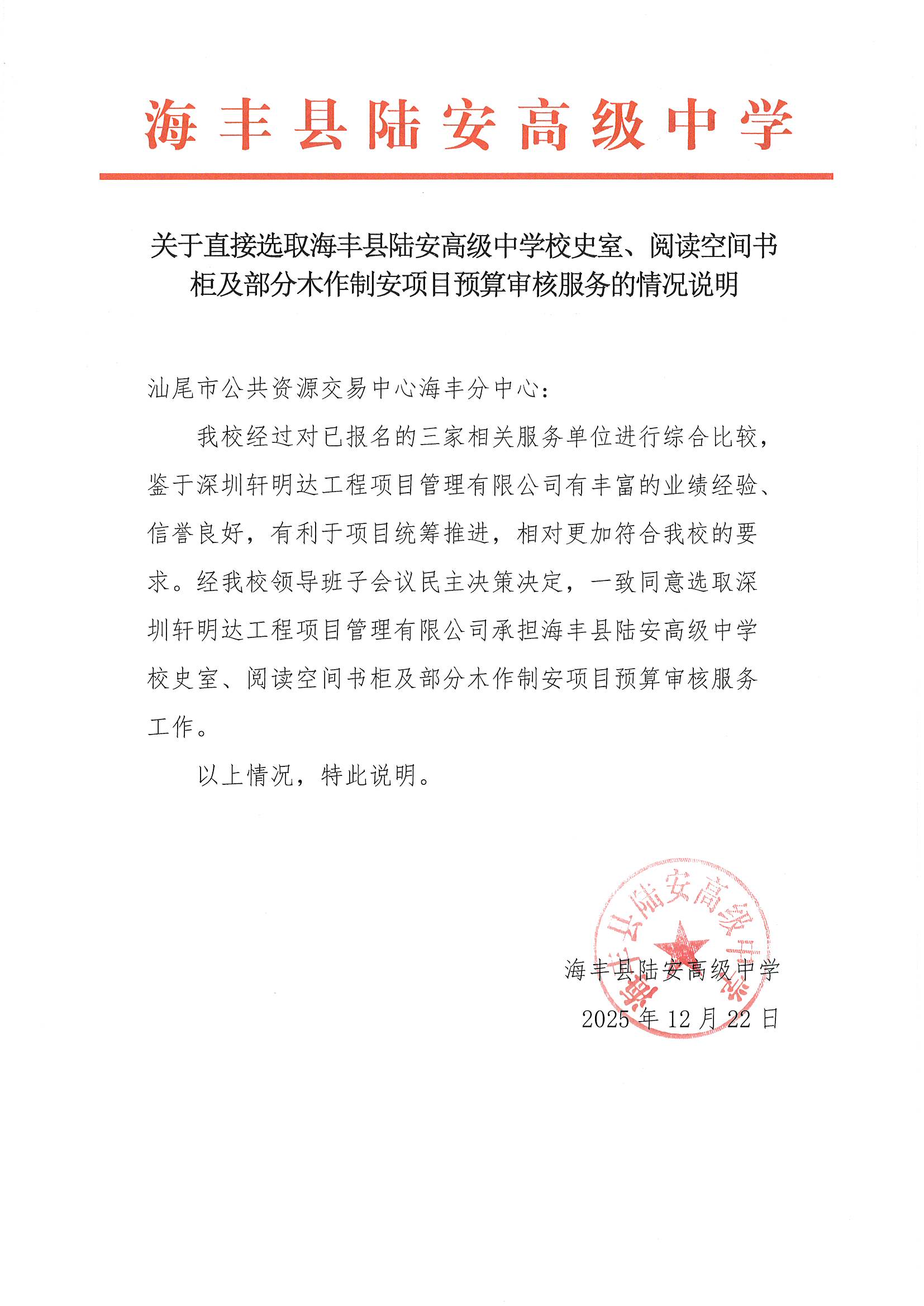 我校经过对已报名的三家相关服务单位进行综合比较,鉴于深圳轩明达工程项目管理有限公司有丰富的业绩经验、信誉良好,有利于项目统筹推进,相对更加符合我校的要求。经我校领导班子会议民主决策决定,一致同意选取深圳轩明达工程项目管理有限公司承担海丰县陆安高级中学校史室、阅读空间书柜及部分木作制安项目预算审核服务工作。