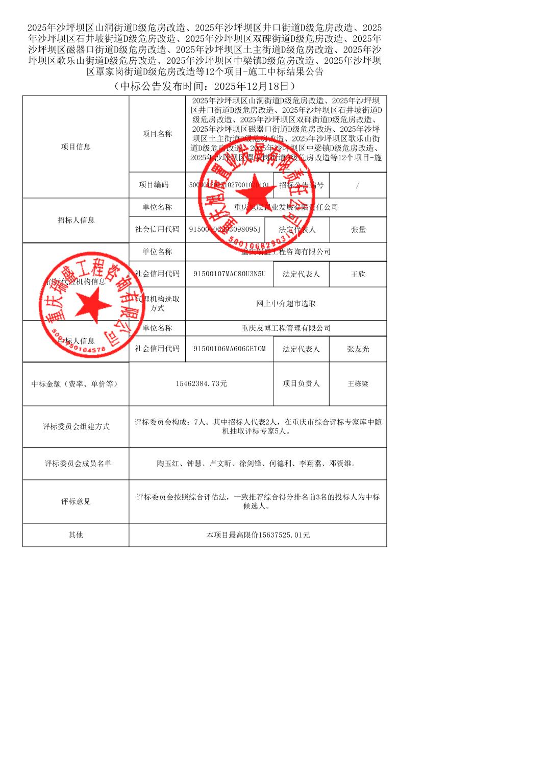 2025年沙坪坝区山洞街道D级危房改造、2025年沙坪坝区井口街道D级危房改造、2025年沙坪坝区石井坡街道D级危房改造、2025年沙坪坝区双碑街道D级危房改造、2025年沙坪坝区磁器口街道D级危房改造、2025年沙坪坝区土主街道D级危房改造、2025年沙坪坝区歌乐山街道D级危房改造、2025年沙坪坝区中梁镇D级危房改造、2025年沙坪坝区覃家岗街道D级危房改造等12个项目-施工中标结果公告
