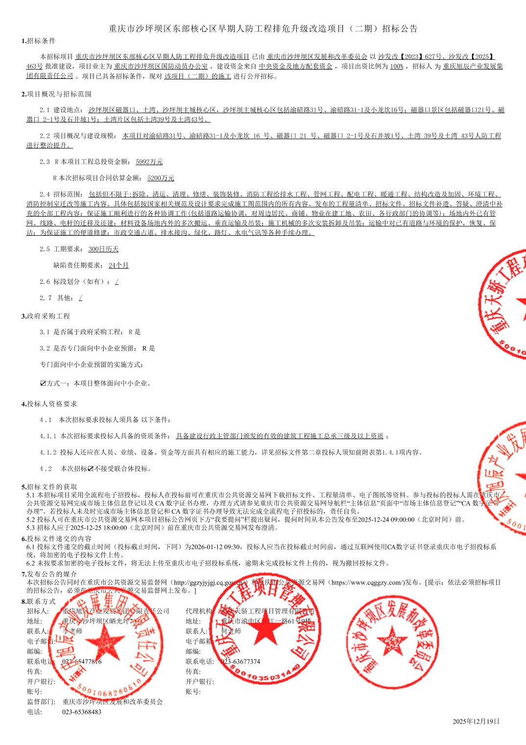 重庆市沙坪坝区东部核心区早期人防工程排危升级改造项目(二期)招标公告