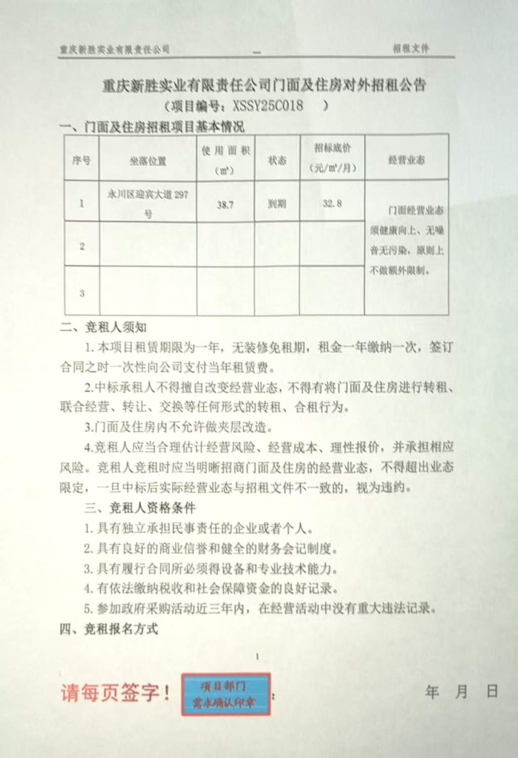 重庆新胜实业有限责任公司(租售方)对门 面 招 租第二次(项目)采用一次性报价模式发起了公开招租,欢迎符合项目要求竞买方参与一次性报价