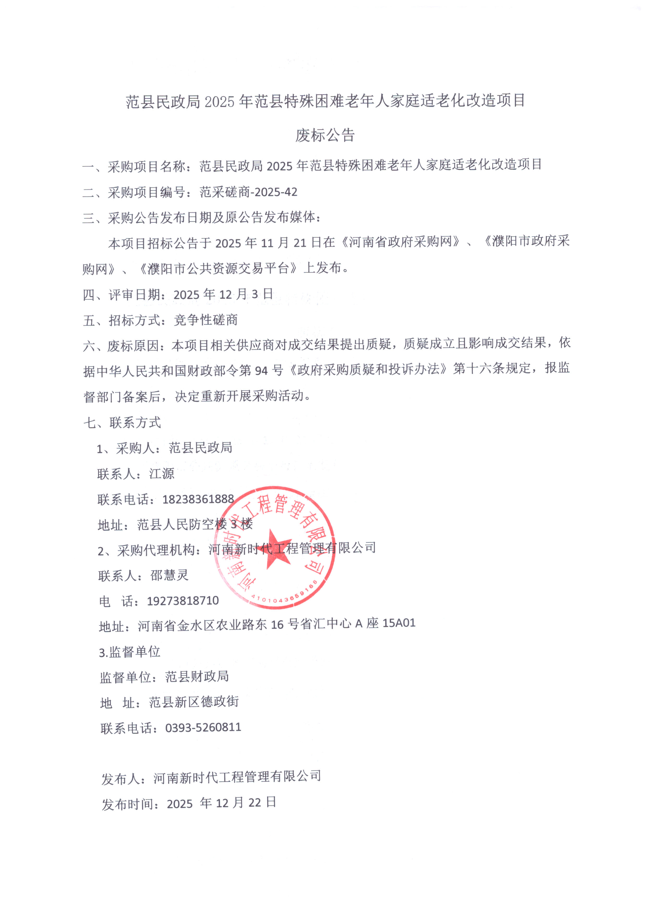 范县民政局2025年范县特殊困难老年人家庭适老化改造项目-废标公告