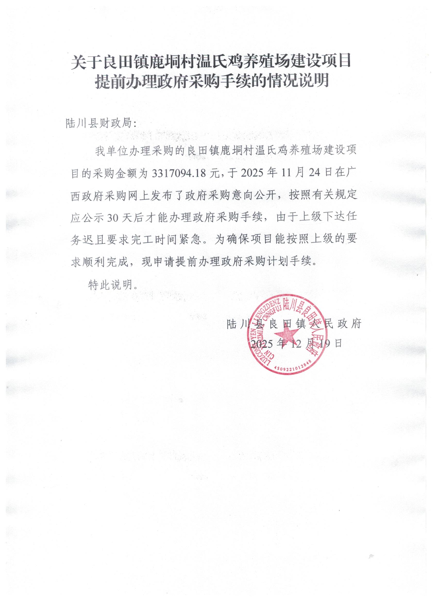 良田镇鹿垌村温氏鸡养殖场建设项目采购项目的潜在供应商应在广西政府采购云平台线上获取获取采购文件,并于****年**月**日 **:**(北京时间)前提交响应文件。
