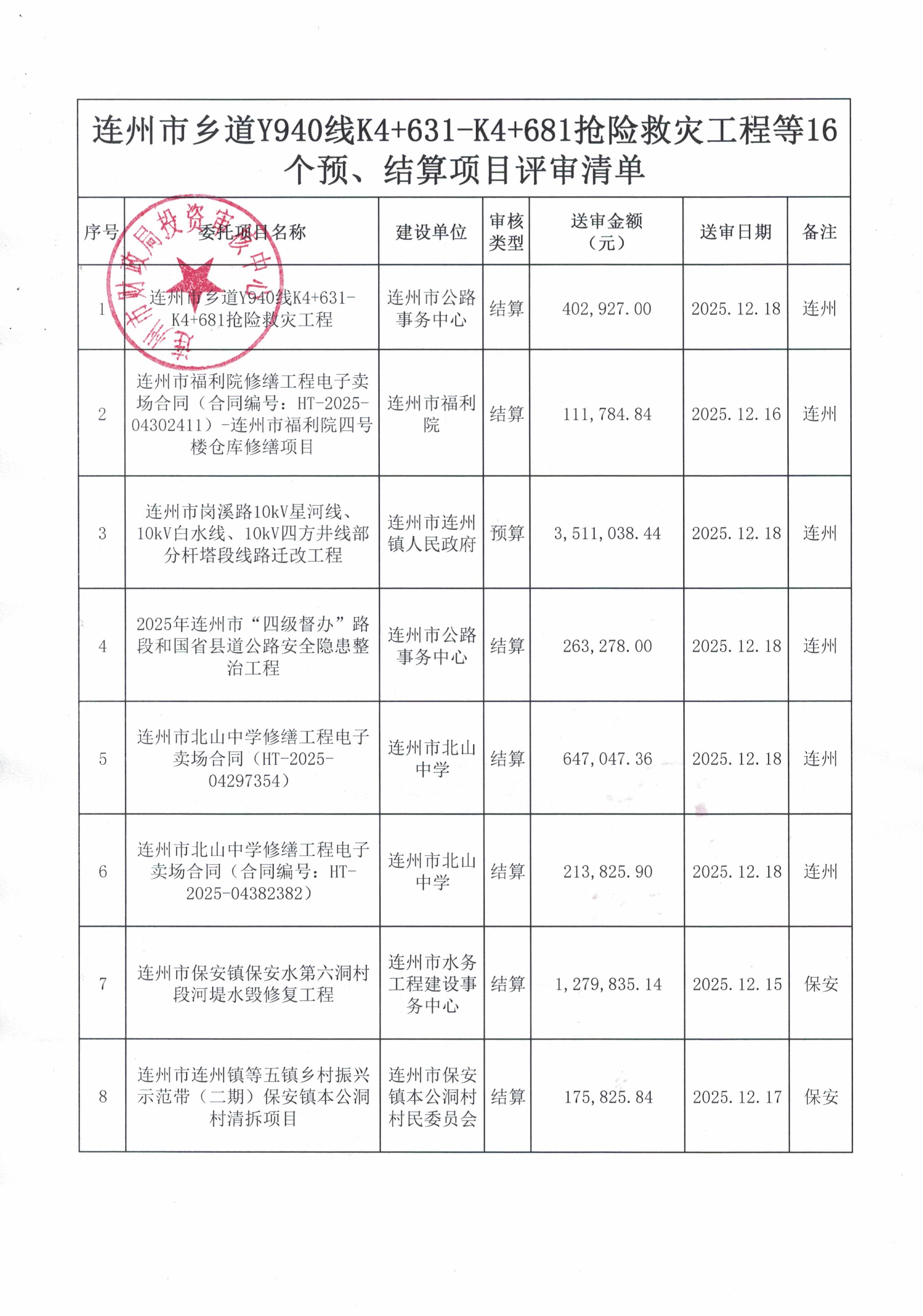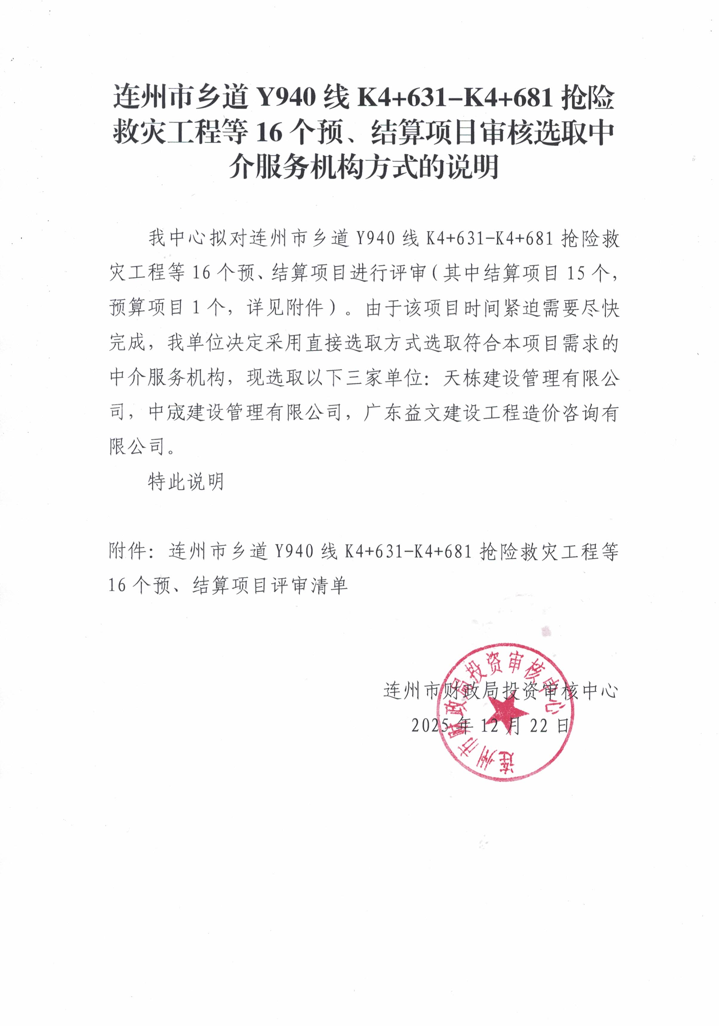 连州市乡道Y940线K4+631-K4+681抢险救灾工程等16个预、结算项目评审采购公告
