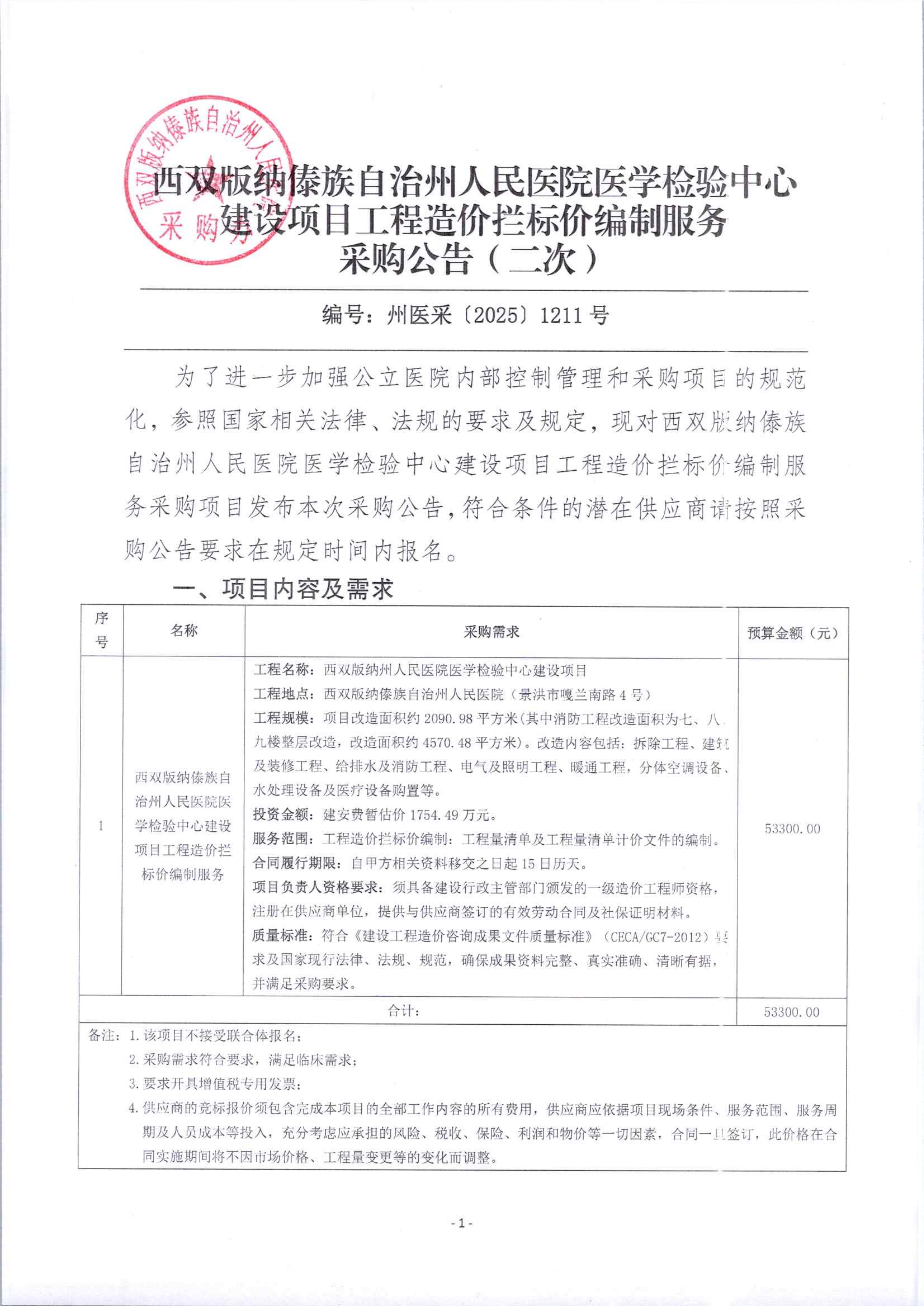 西双版纳傣族自治州人民医院医学检验中心建设项目工程造价拦标价编制服务采购公告(二次)