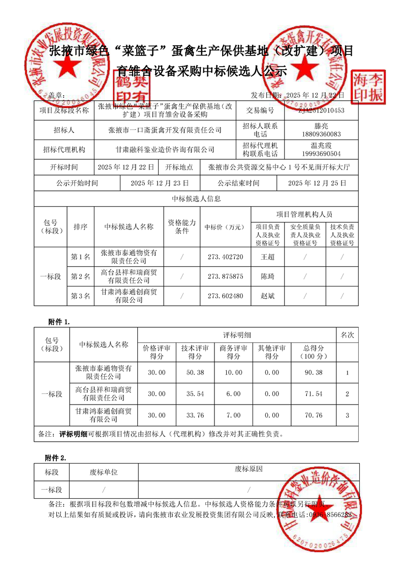 [市本级]张掖市绿色“菜篮子”蛋禽生产保供基地(改扩建)项目育雏舍设备采购中标候选人公示交易结果公示