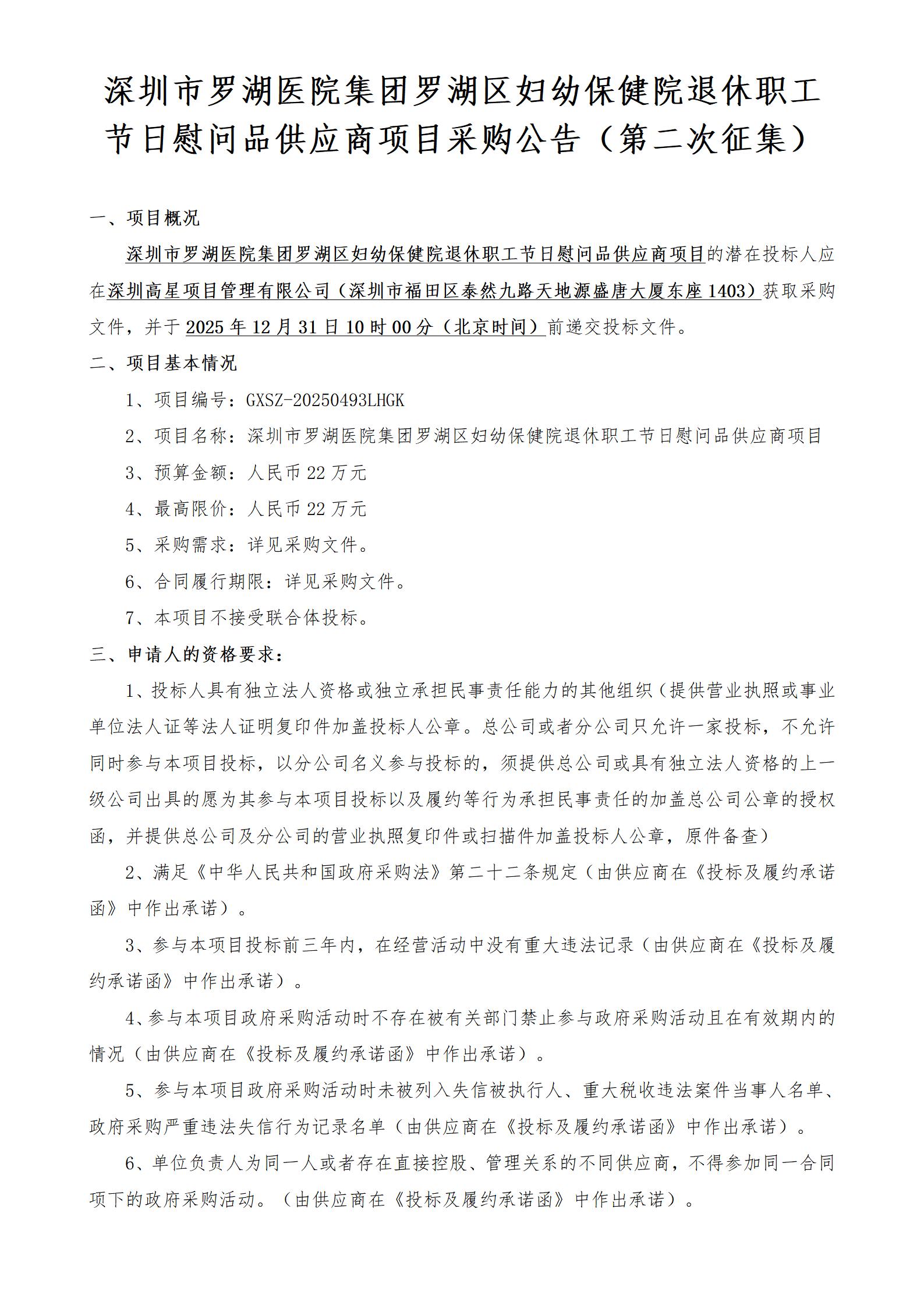 2深圳市罗湖医院集团罗湖区妇幼保健院退休职工节日慰问品供应商项目的采购公告