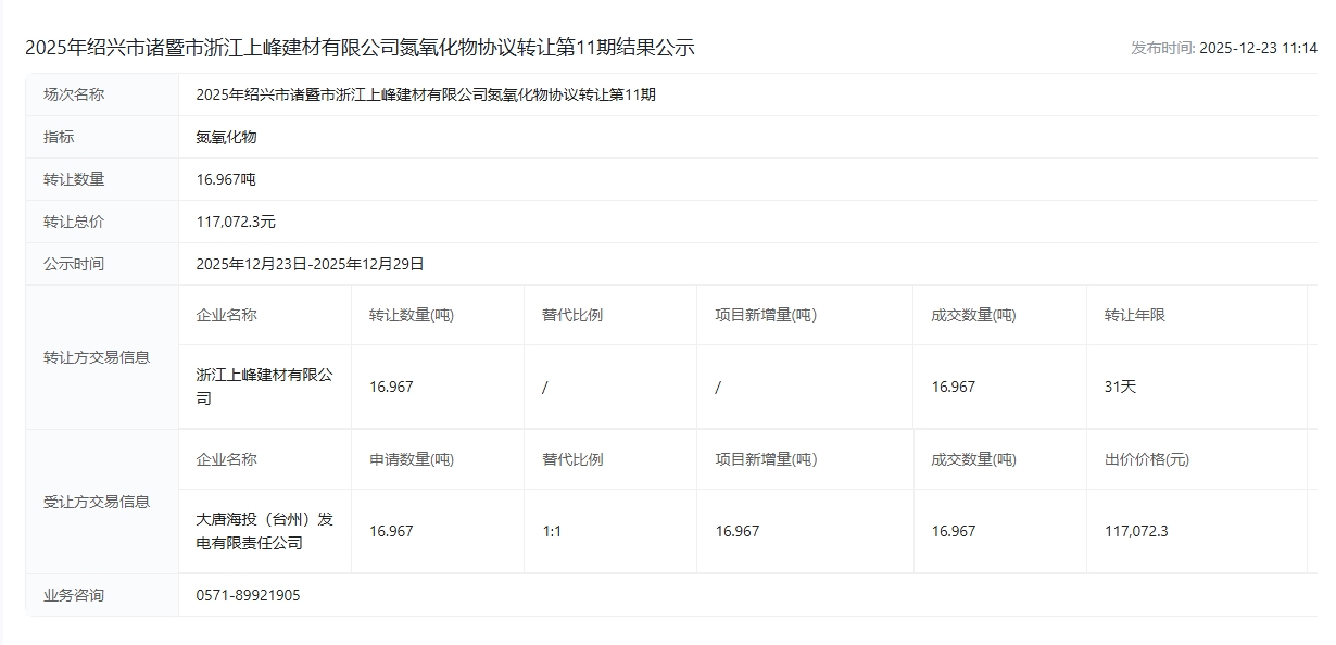 2025年绍兴市诸暨市浙江上峰建材有限公司氮氧化物协议转让第11期结果公示