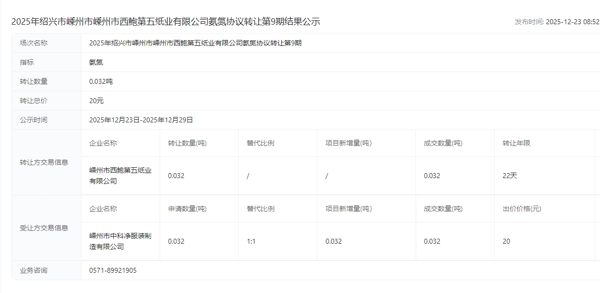 2025年绍兴市嵊州市嵊州市西鲍第五纸业有限公司氨氮协议转让第9期结果公示