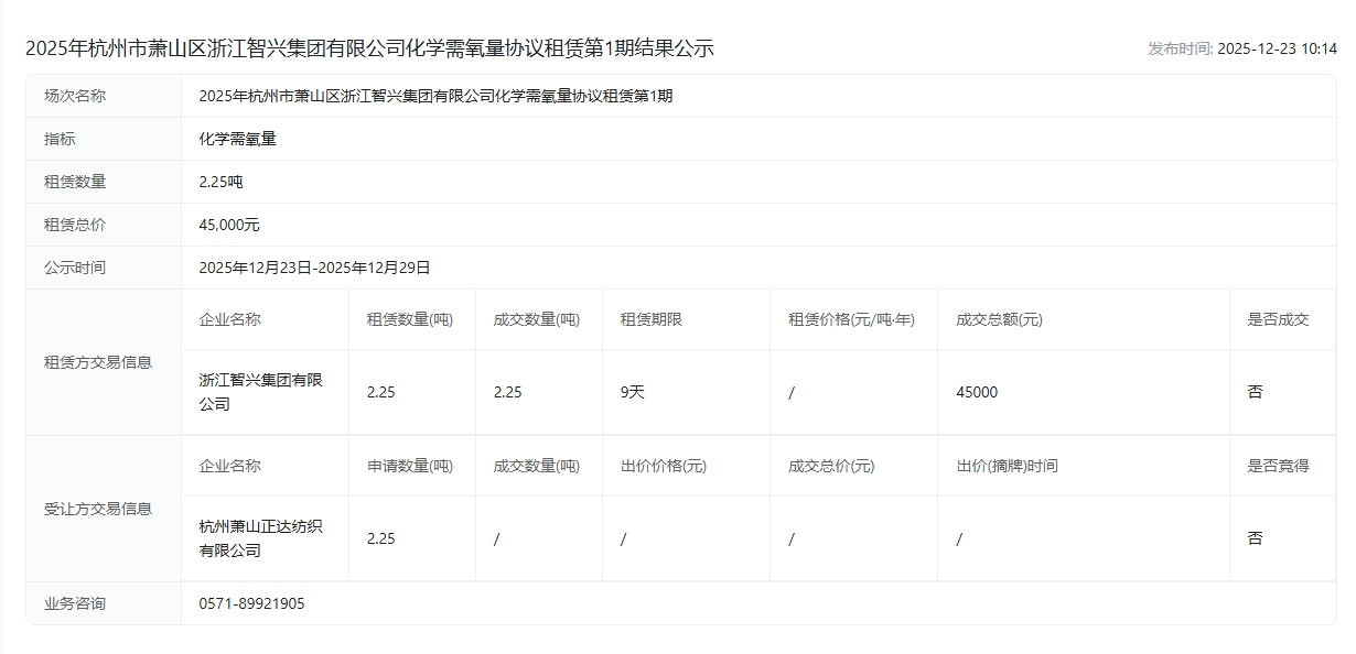 2025年杭州市萧山区浙江智兴集团有限公司化学需氧量协议租赁第1期结果公示