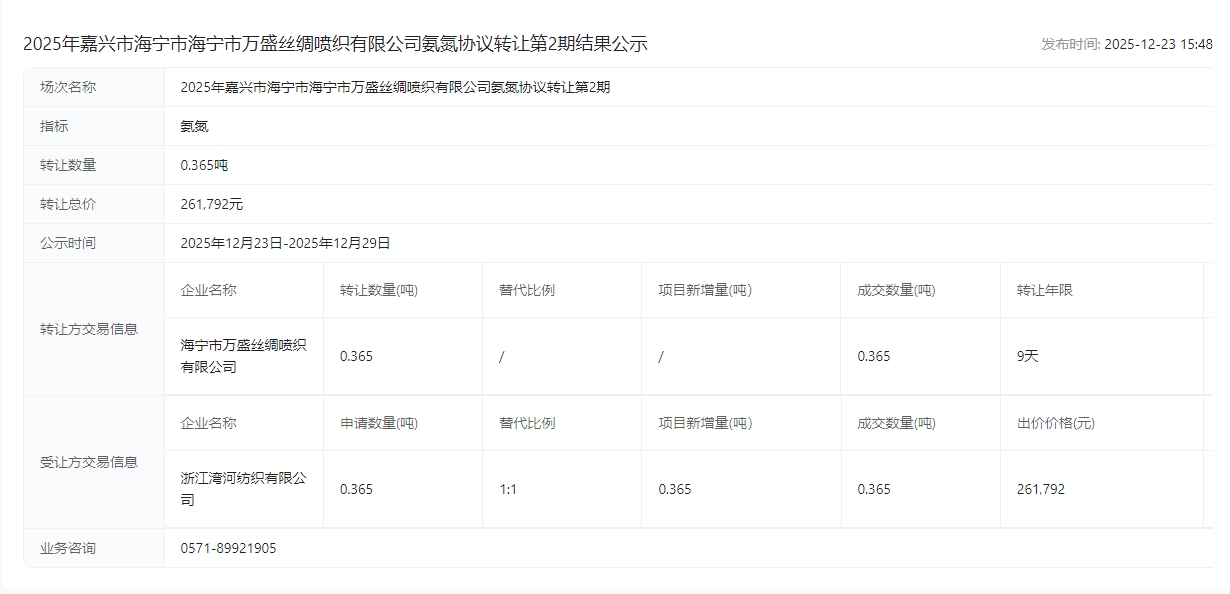 市海宁市海宁市万盛丝绸喷织有限公司氨氮协议转让第*期结果公示
