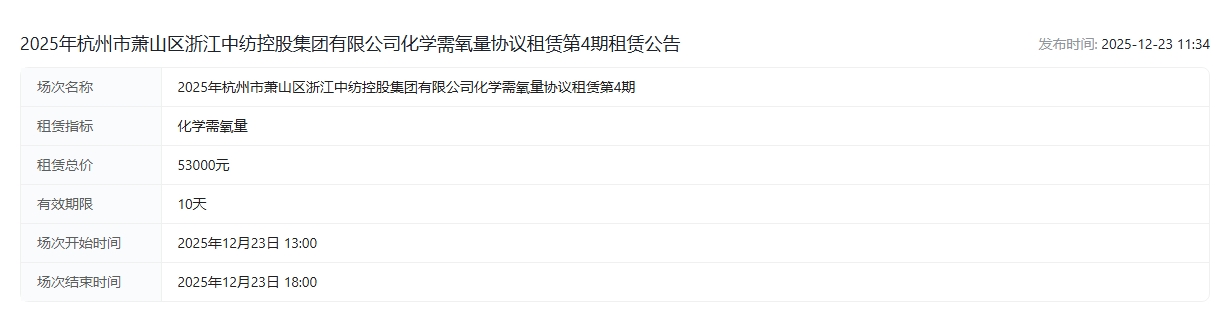 2025年杭州市萧山区浙江中纺控股集团有限公司化学需氧量协议租赁第4期租赁公告交易公告