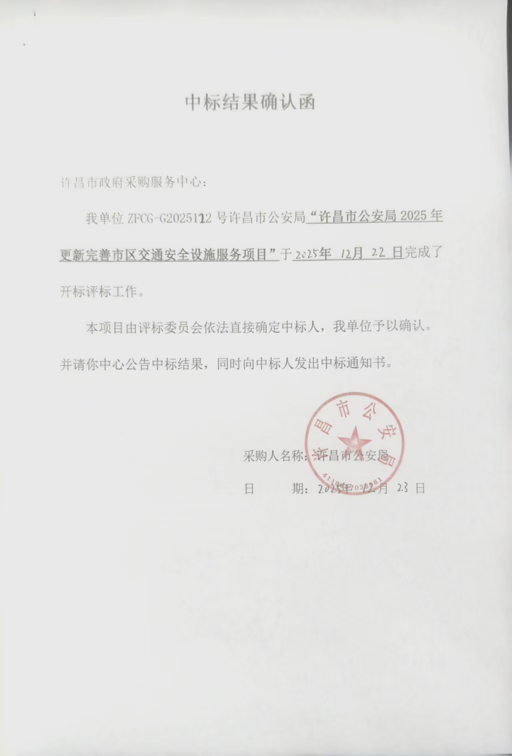 ZFCG-G2025122号许昌市公安局“许昌市公安局 2025年更新完善市区交通安全设施服务项目”-中标公告