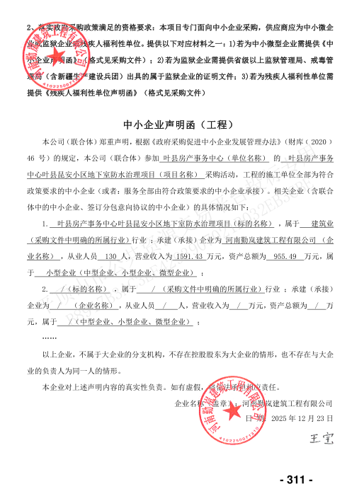 【平公资采20251216号】叶县房产事务中心叶县昆安小区地下室防水治理项目-成交公告
